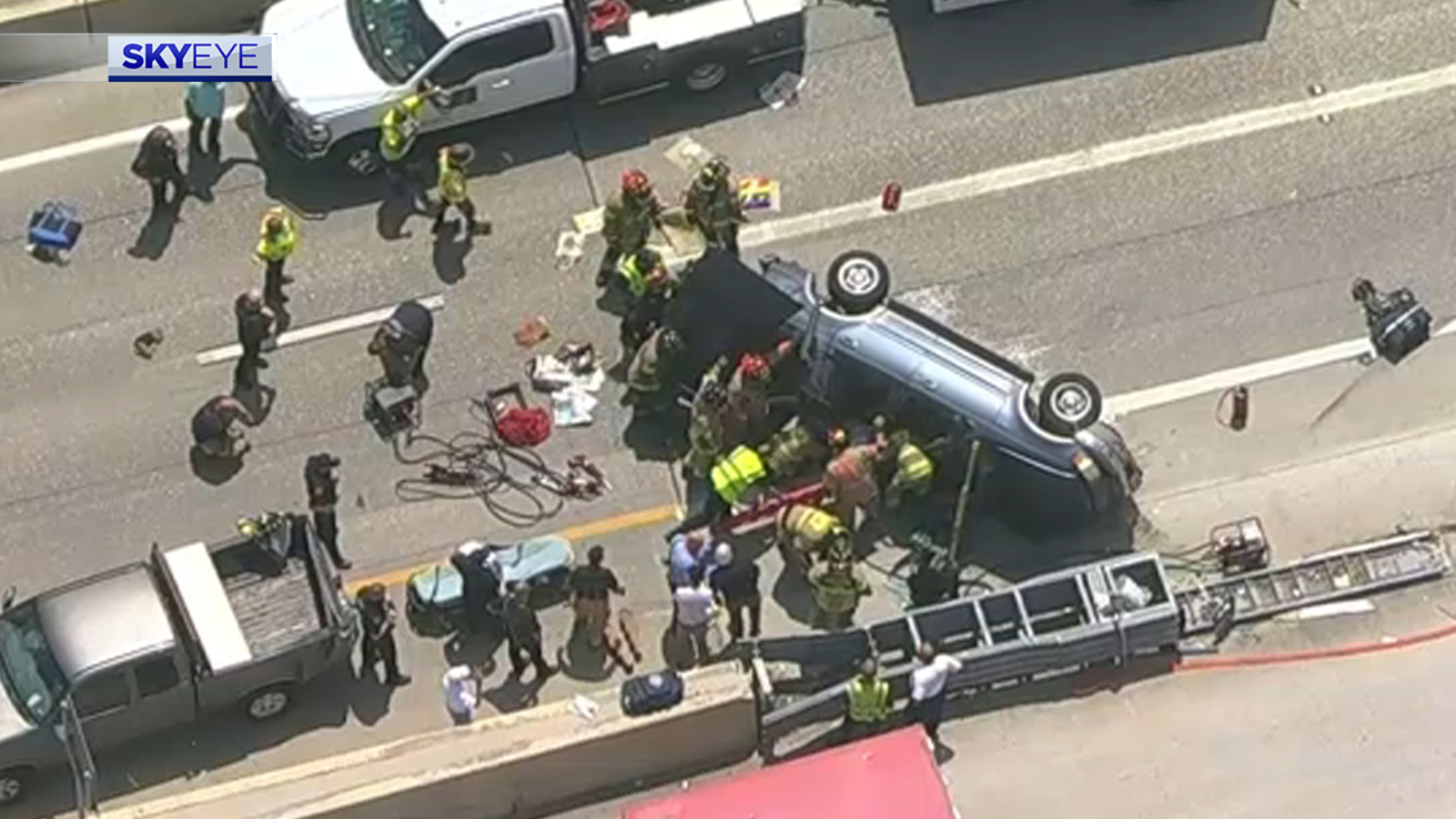 On Tuesday, SkyEye spotted a vehicle on an exit ramp off the Northwest Freeway on its side. One person was spotted peeking out of the vehicle. Shortly after, multiple crews were seen trying to rescue another person who was trapped inside.
