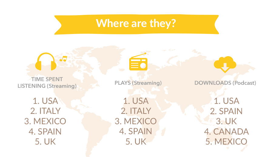 The United States keeps its first place standing in Spreaker’s community, followed by Italy for streaming and then by Spain for number of downloads. We have some new entries on the download side: welcome onboard to Canada and Spain!